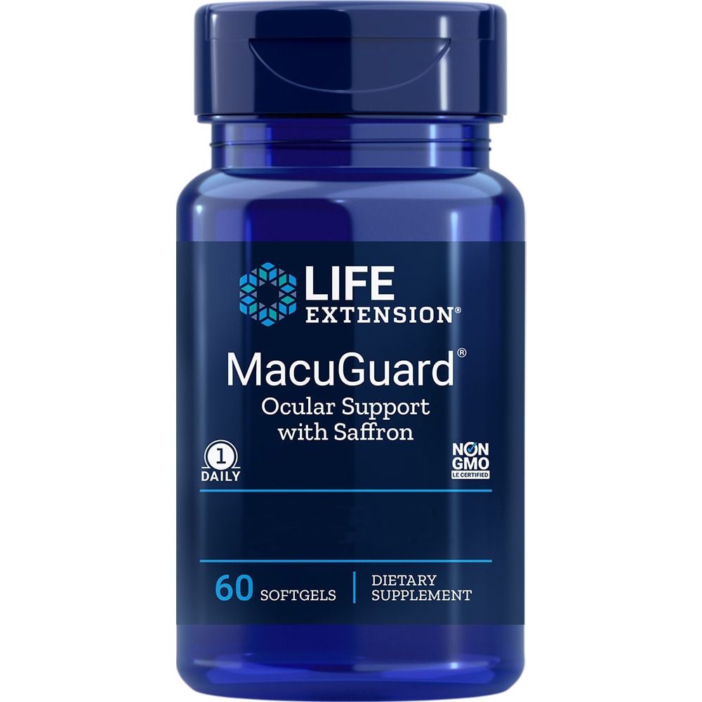 Ingredients: proprietary MacuGuard® blend (phospholipids, marigold flower extract (LuteinPlus®; Tagetes erecta), mixed carotenoids), saffron scar extract, blackcurrant fruit extract, extra virgin olive oil, glazing agent: Gelatine (bovine; capsule); humectant: glycerol; safflower oil, glazing agent: beeswax; palm oil, purified water, thickener: gum arabic; potato maltodextrin
